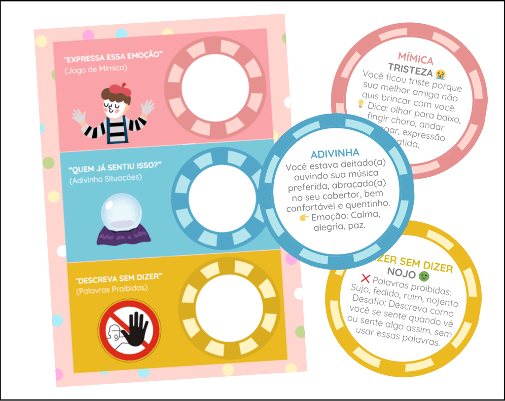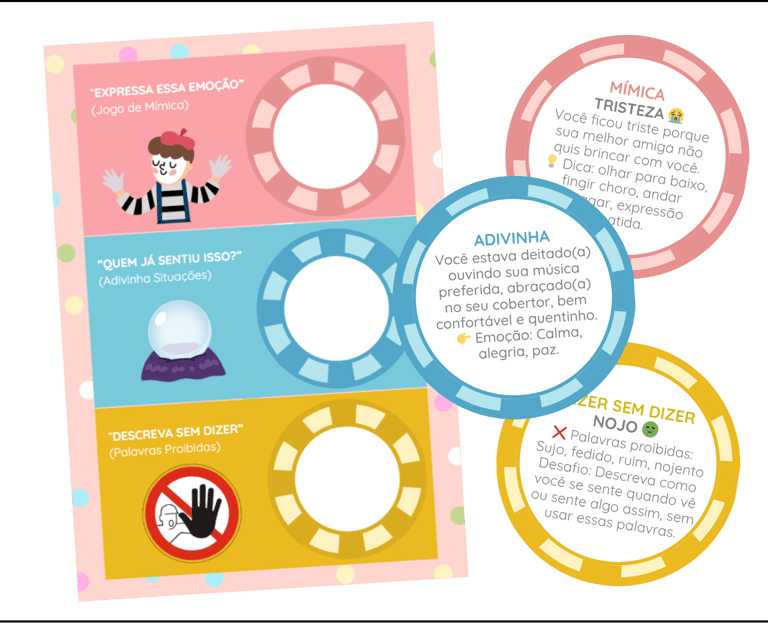 Juego divertido de adivinanza donde los niños representan emociones mediante mímicas, gestos, expresiones faciales y corporales. Favorece la comunicación no verbal, escucha activa y habilidades sociales de forma lúdica y creativa.